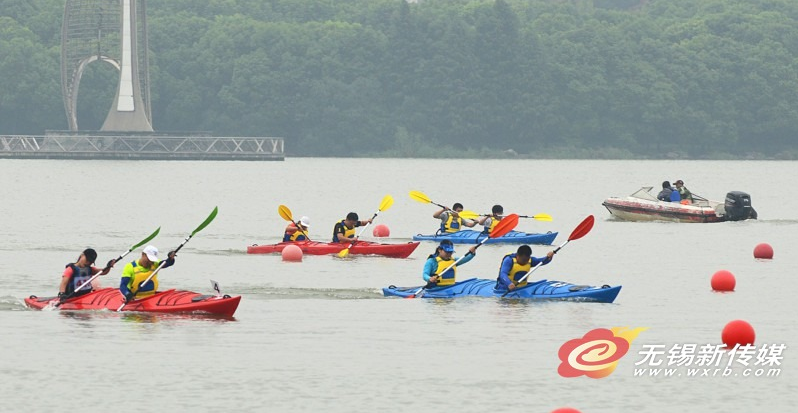 Kayakers paddle furiously at the finals of the Wuxi Lihu National Fitness Canoeing Race in Binhu district, Wuxi on Sept 24. [Photo/pic.wxrb.com] |