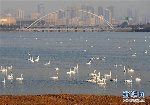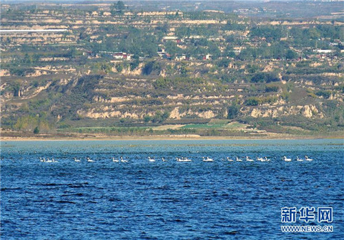 | White swans migrate during winter to the Yellow River Wetland in Sanmenxia. [Photo/xinhuanet.com] |