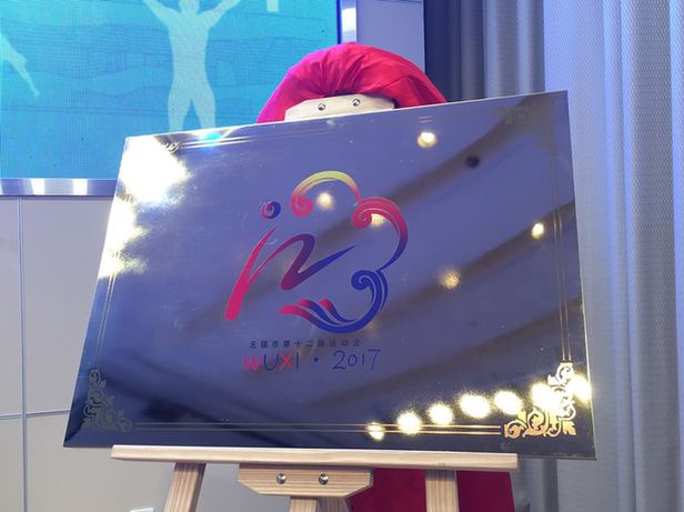 | The emblem for Wuxi's 12th Sports Meeting is unveiled at the press conference. It was designed by Lai Lifan, a student from Wuxi-based Jiangnan University. [Photo by Qin Jun / China Daily] |
