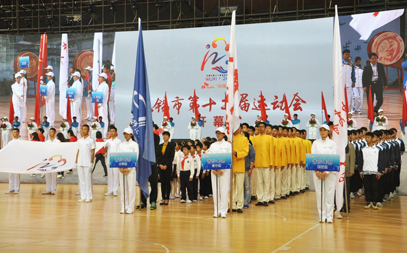 The ceremony started with a procession of 21 teams marching into the stadium, including groups bearing China's national flag and the competition emblem and teams representing each of Wuxi's county-level cities and districts.