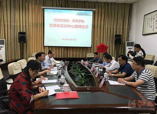 Hechi Daily and Hechi University jointly launched an all-media training center to cultivate skilled media personnel. An unveiling ceremony and symposium was held in the university on Oct 13.