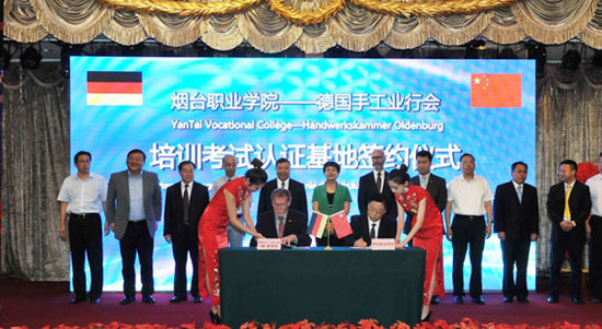 | Yantai Vocational College signed a contract with the German Handwerkskammer (HWK), or the Chamber of Skilled Crafts, to conduct educational cooperation in July. [Photo/yantai.gov.cn] |