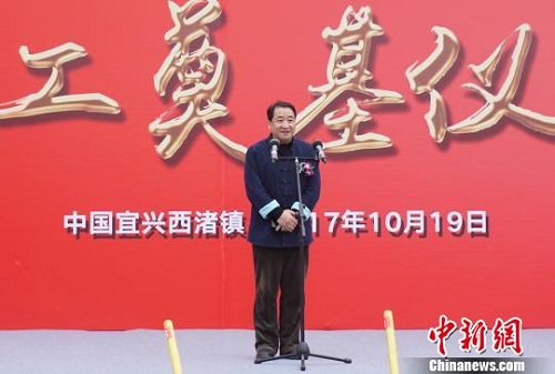 Jiang Kun, investor of the theater and a famous crosstalk comedian delivers a speech at the theater's foundation stone laying ceremony held in Yixing, Jiangsu province on Oct 18. [Photo/ chinanews.com]