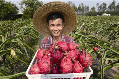 The output of his dragon fruit fields is estimated to reach 3500-4000 kilos this year and bring in 1.5-2 billion yuan per mu with the products sold to Beijing, Shanghai, Shandong and Fujian.