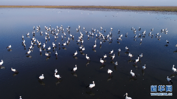 | Over 600 migrating oriental white storks arrive at Momoge Wetland to spend winter in southern China. [Photo/Xinhua] |