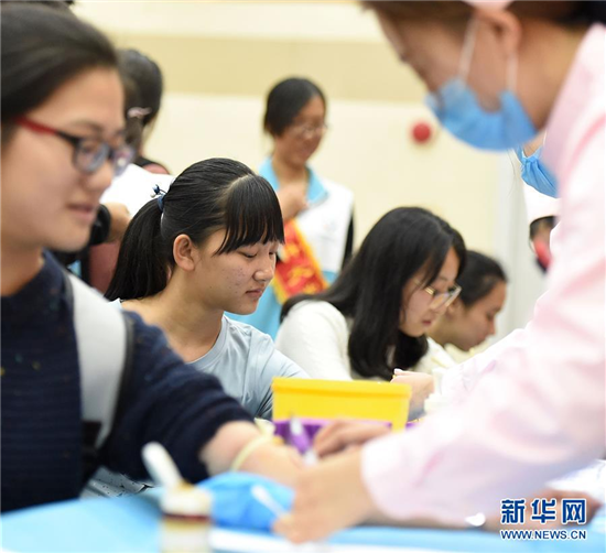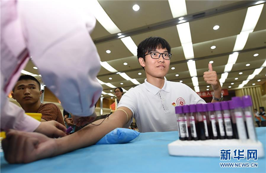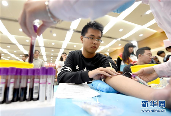 | A student from Tianjin Medical University donates hematopoietic stem cells. [Photo/Xinhua] |