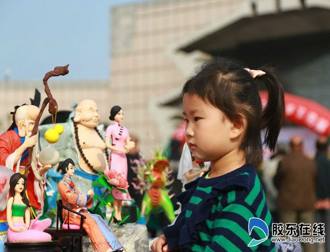 A girl admires exquisite dough modeling creations during an exhibition held in Penglai, Shandong province. [Photo/jiaodong.net]