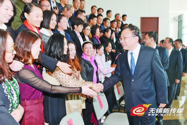 | Wuxi Party Secretary Li Xiaomin and Mayor Wang Quan expressed congratulations to the recognized teams and groups on the closing ceremony of Wuxi's 12th Sports Meeting on Oct 31. [Photo/wxrb.com] |