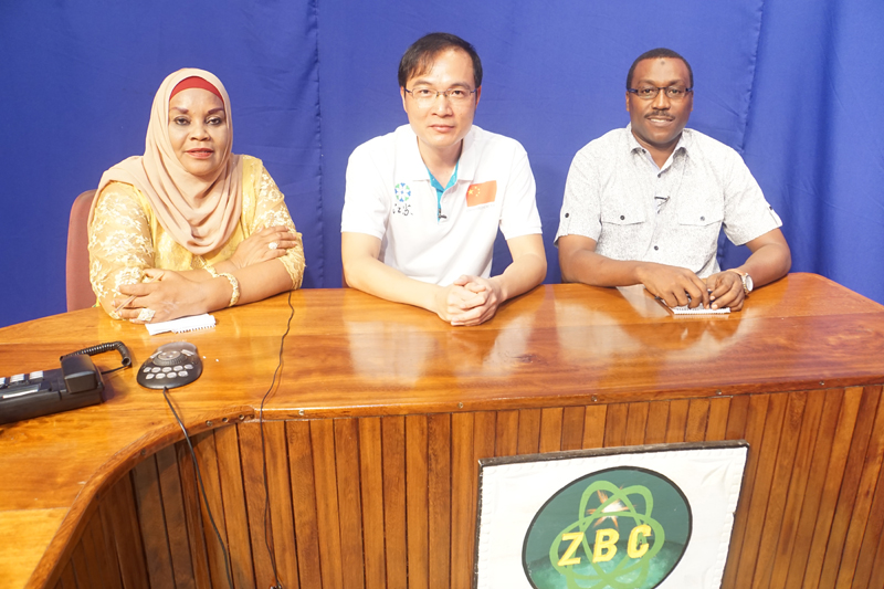 Zhao attends a lecture held by ZBC, the local TV station in Zanzibar, to introduce eye health knowledge. [Photo/Wuxi People's Hospital]