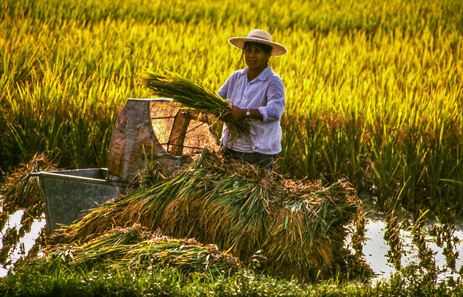 Threshing the rice stalks in Lianxian 1993. [Photo by Bruce Connolly/chinadaily.com.cn]