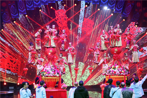 | Wuchuan Piaose is performed at the competition, with children aged between six and 12 held aloft on a hidden steel bar, dressed in red and holding lanterns. [Photo by Li Zhong/Zhanjiang Daily] |
