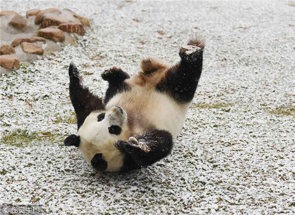 Meng Meng has fun in snow in Changchun, on Nov 2, 2017. [Photo/VCG]