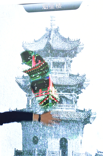 | This is an image of an old building in Changchun. Visitors to the center change the color of the picture by moving their hands in front of it. [Photo/cnjiwang.com] |