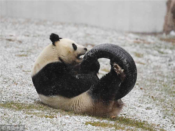 Meng Meng plays with a tire in snow in Changchun, on Nov 2, 2017. [Photo/VCG]