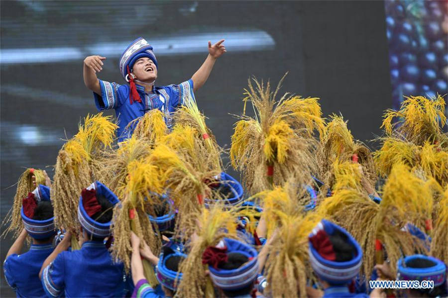 | Actors perform a dance during the Yifan festival in Luocheng, Southwest China's Guangxi Zhuang autonomous region, Nov 7, 2017. Local villagers of Mulam ethnic group gathered here to celebrate the festival of "Yifan", meaning thankfulness and good harvest in the language of Mulam ethnic group. [Photo/Xinhua] |