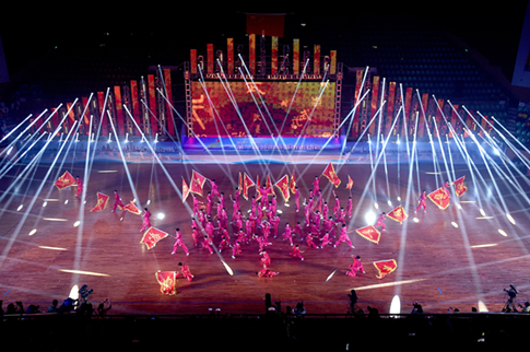 The opening ceremony of Beibu Gulf Sports Meet is held at Zhanjiang Sports Stadium on Nov 6. [Photo by Liu Jicheng/Zhanjiang Daily]