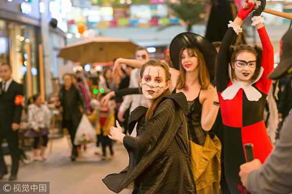 Some foreigners dress up as zombies for upcoming Halloween to attract customers at a shopping mall in Shenyang, Liaoning province, Oct 28, 2017. [Photo/VCG]