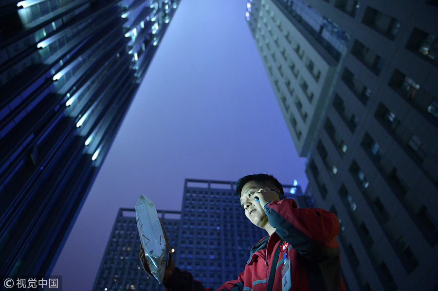 Mai Jiming asks customer's permission to leave the parcel in the mailbox at 8:40 pm in Guiyang, capital of Southwest China's Guizhou province, Nov 11, 2017. [Photo/VCG]