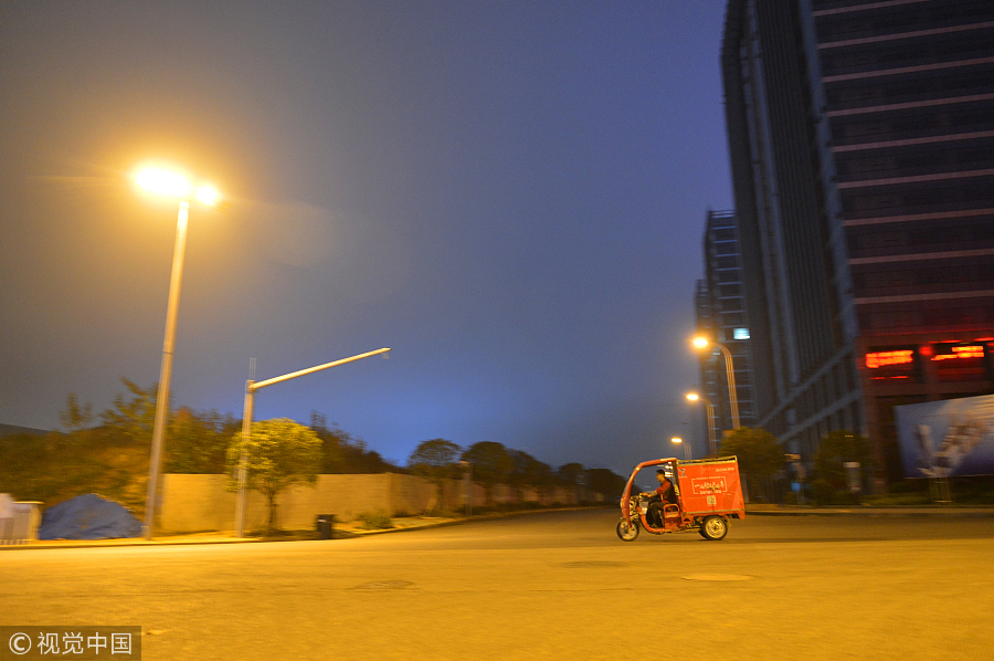 Mai Jiming delivers the last nine parcels for the day, in Guiyang, capital of Southwest China's Guizhou province, at 8:30 pm, Nov 11, 2017. [Photo/VCG]