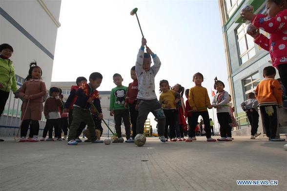 Children take part in an amusing sports meeting at a kindergarten in Yantai, East China's Shandong province, on Nov 13, 2017. [Photo by Shen Jizhong/Xinhua]