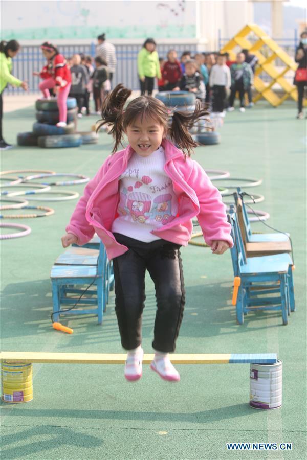 A little girl takes part in an amusing sports meeting at a kindergarten in Yantai, East China's Shandong province, on Nov 13, 2017. [Photo by Shen Jizhong/Xinhua]