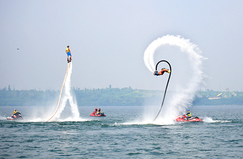 | Water stunts are performed during the 2017 National Water Skiing Tournament held at the Huguangyan scenic spot of Zhanjiang. [Photo by Liu Jicheng/Zhanjiang Daily] |