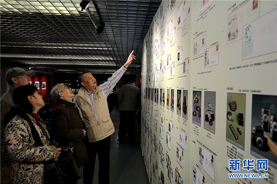 | Li introduces his collection of camera stamps. [Photo/Xinhua] |