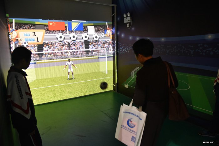 Students experience the interactive football game in the pavilion. [Photo/wxtyzx.cn]