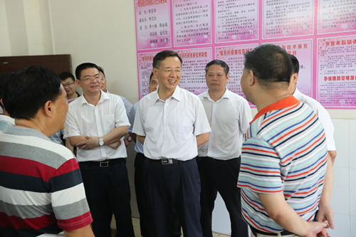 | Jiang Jianjun (C), mayor of Zhanjiang, inspects a grassroots health center in Wuchuan. [Photo/Zhanjiang Daily] |