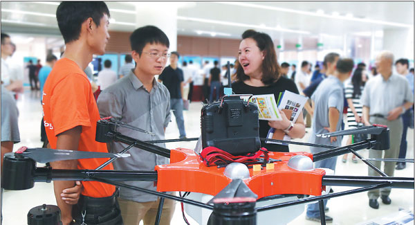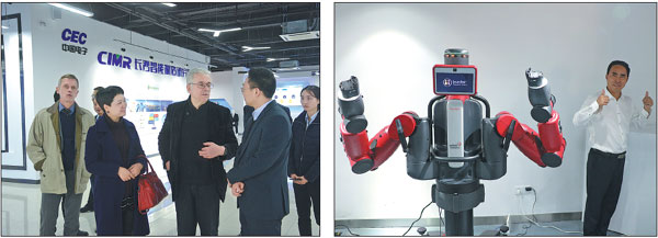 Clockwise from top left: German experts visit an intelligent manufacturing exhibition center in Changsha, Hunan province. PROVIDED TO CHINA DAILY A robot developed by Hunan University students interacts with a visitor. PROVIDED TO CHINA DAILY A drone installed with Beidou navigation system technologies is displayed at a high-tech fair. Yuan Luhua / For China Daily
