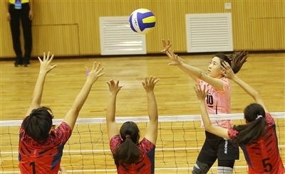 | Players contest each other at the net in a volleyball match. [Photo/Zhanjiang Evening Post] |