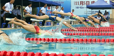 | Swimmers dive into water at the starting whistle. [Photo/Zhanjiang Evening Post] |