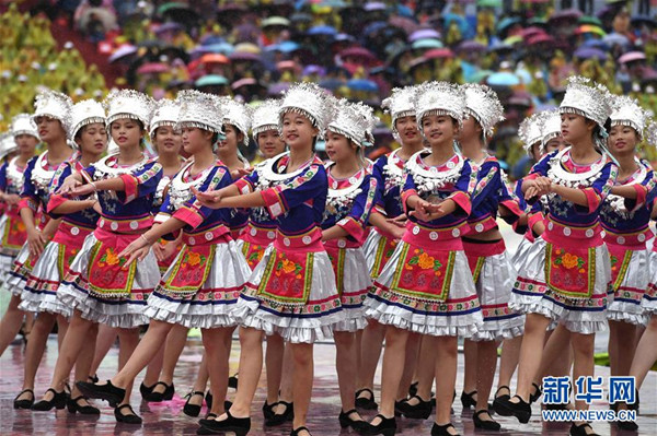Each dance in the anniversary festivities features its distinctive costuming.[Photo by Zhou Hua/www.news.cn]