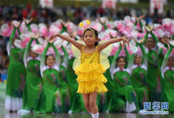 A young girl stands out in yellow at the anniversary festivities.[Photo by Zhou Hua/www.news.cn]
