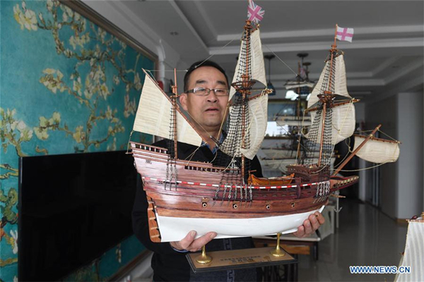 Zhao Jinlong presents an ancient ship model in Jilin, Northeast China's Jilin province, Nov 18, 2017. [Photo/Xinhua]