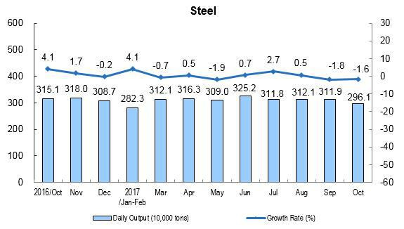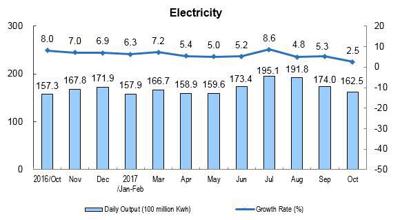 In October 2017, the total value added of the industrial enterprises above designated size was up by 6.2 percent year-on-year in real terms (the following growth rates of value added are real growth rates, after deducting price factors), a decrease of 0.4 percentage points from September. In October, the total value added of the industrial enterprises above designated size went up by 0.50 percent month-on-month. In the first ten months, the total value added of the industrial enterprises above designated size was up by 6.7 percent year-on-year.