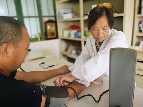 | Li Guizhen, a 69-year-old village doctor in Yantai, measures a villager's blood pressure. [Photo/dzwww.com] |