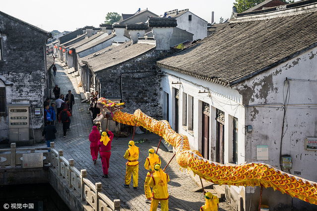 Yuqi dragon dance performers make tour the ancient Yuqi town of Wuxi, Jiangsu province. [Photo/VCG]