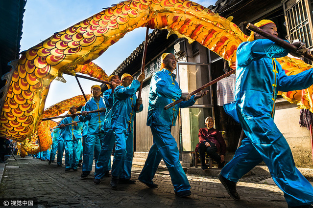 Yuqi dragon dance requires performers to raise and lower the 200-meter dragon puppet to make it "dance". [Photo/VCG]