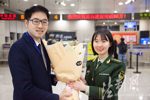 | Mr. Peng from Taiwan becomes the 800,000th passenger of Sunan Shuofang International Airport in Wuxi, Jiangsu province on Nov 24. [Photo/legaldaily.com.cn] |