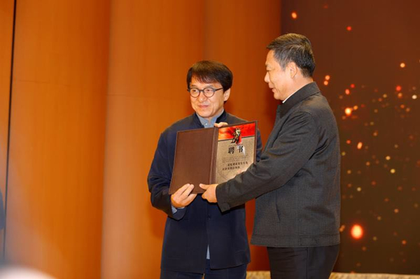| Jackie Chan (L) accepts the letter of appointment to be Chief Director of Changchun Film Studio on Dec 2. [Photo provided to ejilin.gov.cn] |