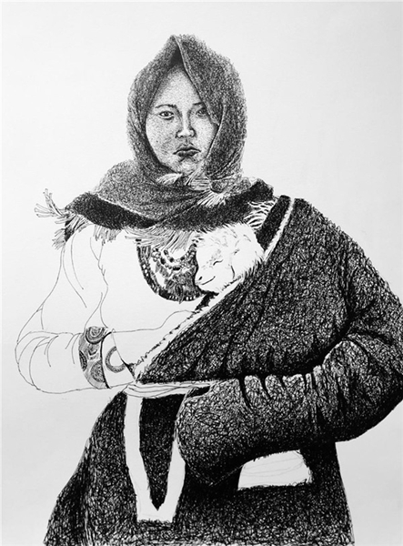 | This pen drawing by Fan depicts a lady dressed in typical and traditional clothes from NE China carrying a lamb. [Photo/Jilin Daily] |