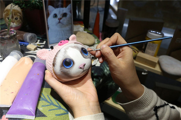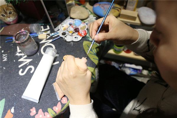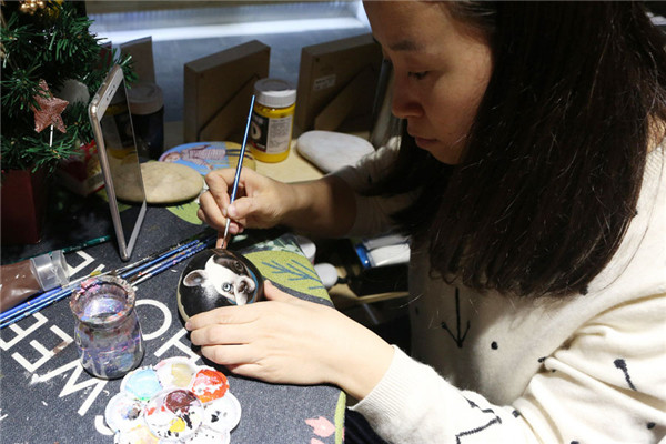 | Zhao Na paints on a cobblestone in her handicraft workshop in Changchun city, Northeast China's Jilin province, Dec 11, 2017.[Photo/IC] |