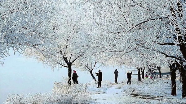| Due to continuous drop of temperature, rime sight appears for the first time this winter on trees along the banks of the Songhua River, Jilin province. The crystal-clear spectacle has attracted many tourists to the scene. [Photo by Han Junhong and Zhou Huiying/ China Daily] |