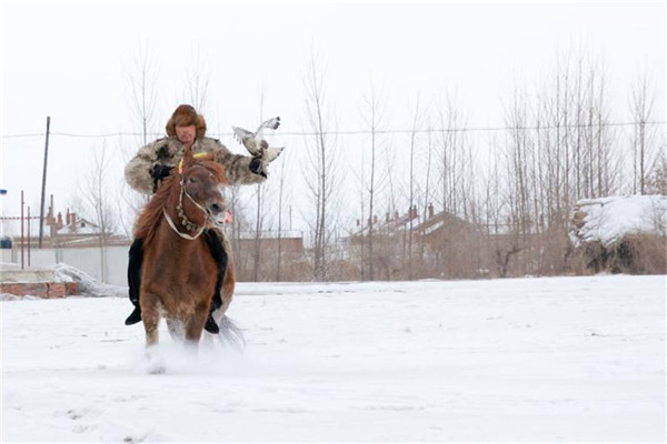 More than 300 Manchu families in the village used to catch wild eagles and train them as hunting partners. They train eagles even as the village is covered with heavy snow, as was the case recently.