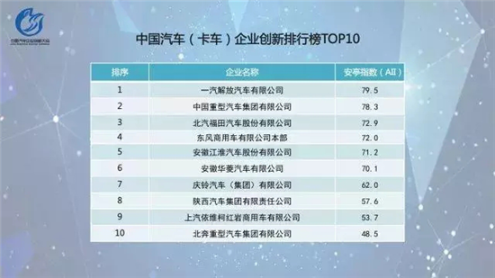 It is based on companies' innovation input, value output and technological structure, reflecting their innovation ability. In term of trucks, FAW Jiefang is at the top of the list with 79.5 points.