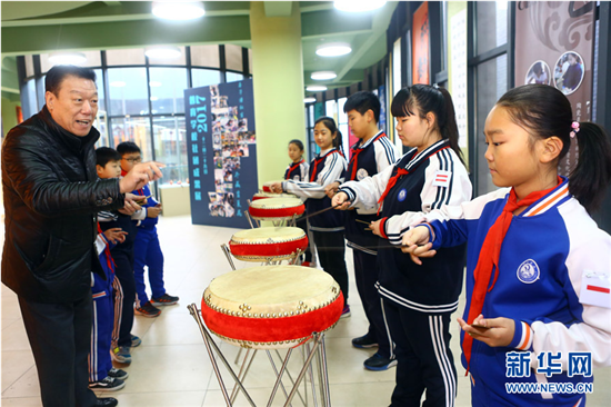 | Primary students in Tianjin Puyu School learn how to play Jingdong Dagu(a talking-singing arts that originates from Hebei Sanhe, Xianghe and Beijing Pinggu, Tianjin Baodi).[Photo/Xinhua] |