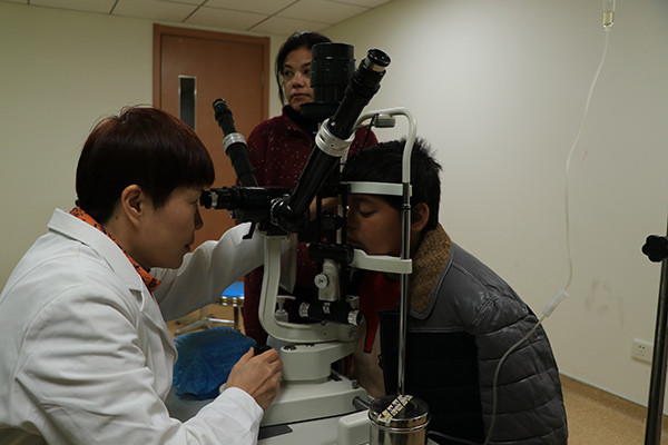 A doctor examines Roj Pariyar's eyes. [Photo provided to chinadaily.com.cn]