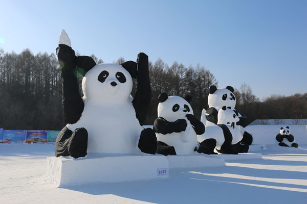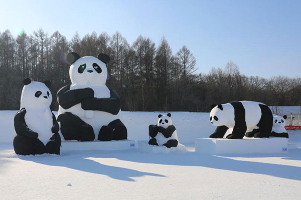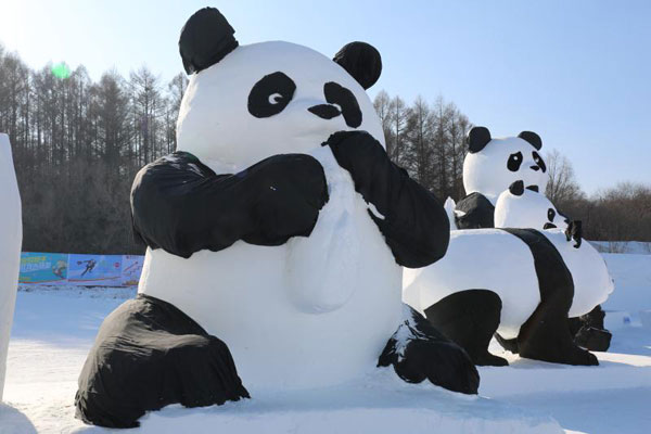 | Panda ice sculptures with different poses on Jingyue Avenue in Changchun, Northeast China's Jilin province. [Photo provided to chinadaily.com.cn] |