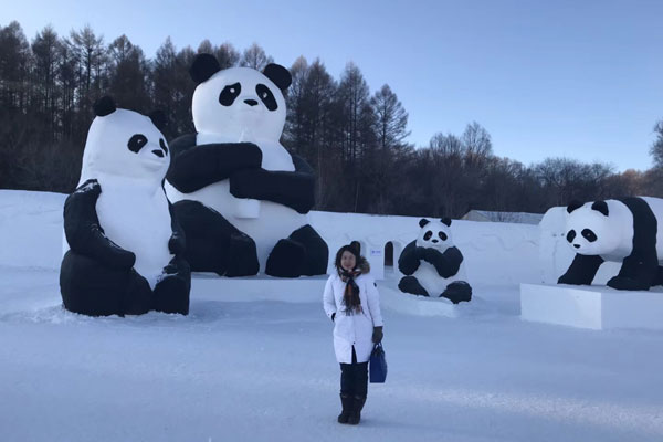 | A visitor poses with the panda ice sculptures on Jingyue Avenue in Changchun, Northeast China's Jilin province. [Photo provided to chinadaily.com.cn] |